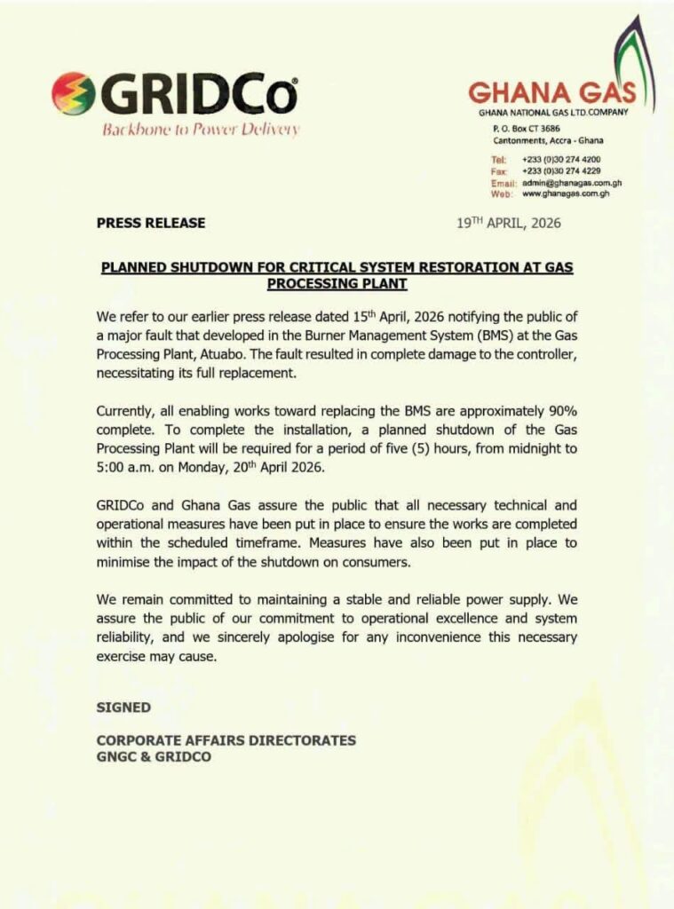 The company, in collaboration with GRIDCo, has assured the public that adequate technical and operational measures have been put in place to ensure the work is completed within the scheduled timeframe. Both institutions also say contingency plans have been developed to minimise any potential disruption to power supply during the shutdown period.