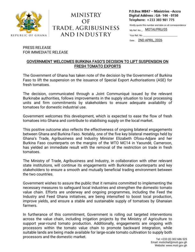 The Government of Ghana has welcomed Burkina Faso’s decision to lift the suspension on fresh tomato exports, a move expected to ease supply challenges in the country.