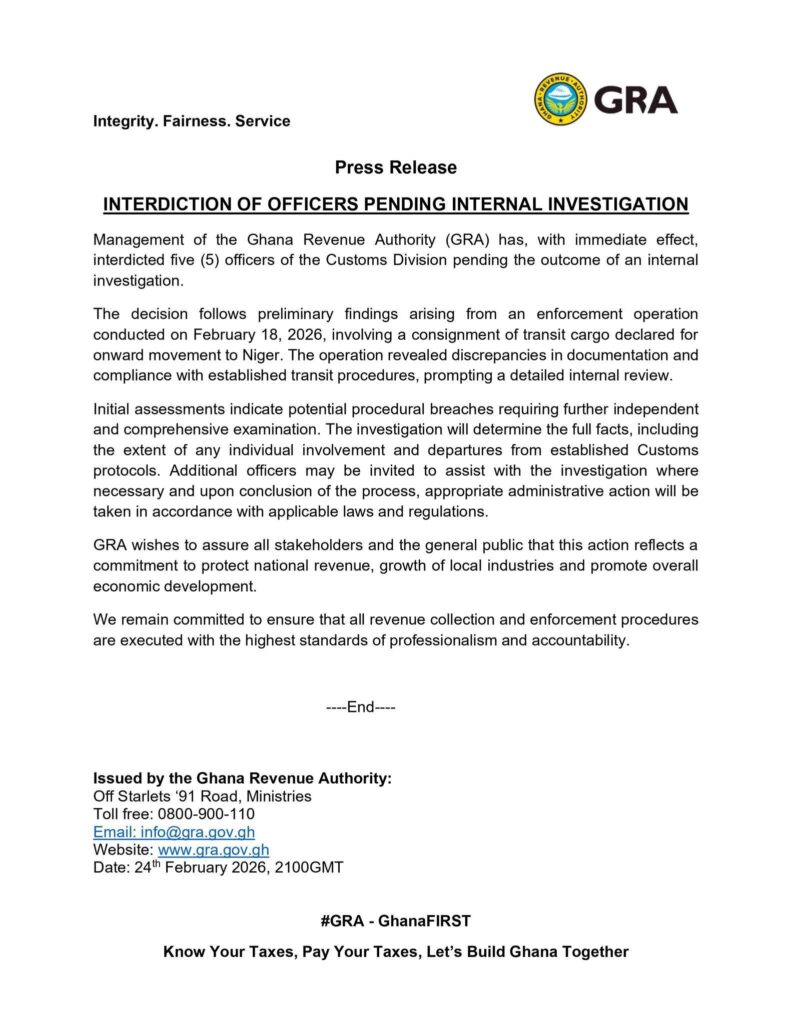 The Ghana Revenue Authority has interdicted five officers of its Customs Division with immediate effect as part of an ongoing investigation into alleged procedural breaches.