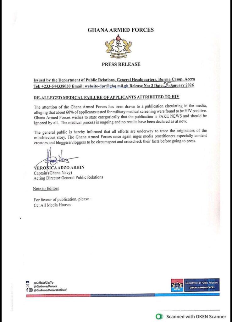 The Ghana Armed Forces (GAF) has firmly denied reports circulating in parts of the media claiming that about 60 per cent of applicants who underwent medical screening for military recruitment tested positive for HIV.
