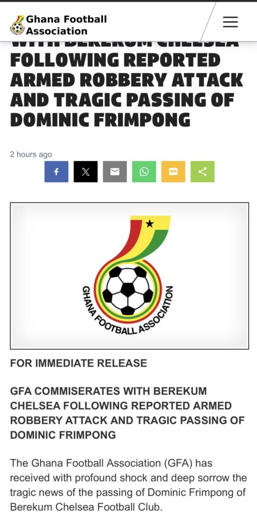 The Ghana Football Association (GFA) has expressed deep sorrow following the tragic death of Berekum Chelsea player Dominic Frimpong, who is believed to have lost his life during an armed robbery attack on the Bibiani–Goaso road.