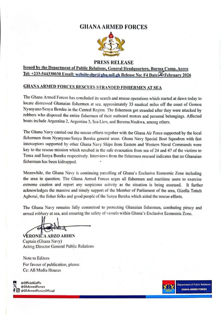 The Ghana Armed Forces also expressed appreciation to the Member of Parliament for the area, Gizella Tetteh Agbotui, as well as local fisherfolk and residents of Senya Bereku, for their swift support, which contributed significantly to the success of the rescue operation.