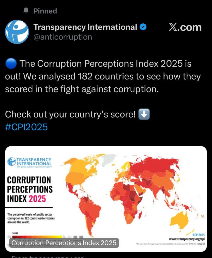 According to a press statement issued on February 10, Ghana’s CPI score rose from 42 in 2024 to 43 out of a possible 100 in 2025. This places the country 76th out of 182 countries assessed worldwide.
