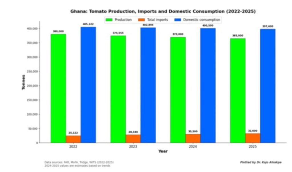 Ghana’s domestic tomato output, however, remains far below national demand. Local production hovers around 350,000 to 370,000 metric tonnes per year, while annual consumption ranges between 800,000 and 1.4 million tonnes. Only about one-third of the country’s tomato needs are met locally, forcing reliance on imports, mainly from Burkina Faso. The Chamber of Agribusiness estimates that this reliance on imported tomatoes costs Ghana roughly GH¢5.7 billion annually, about 1.2 percent of GDP.