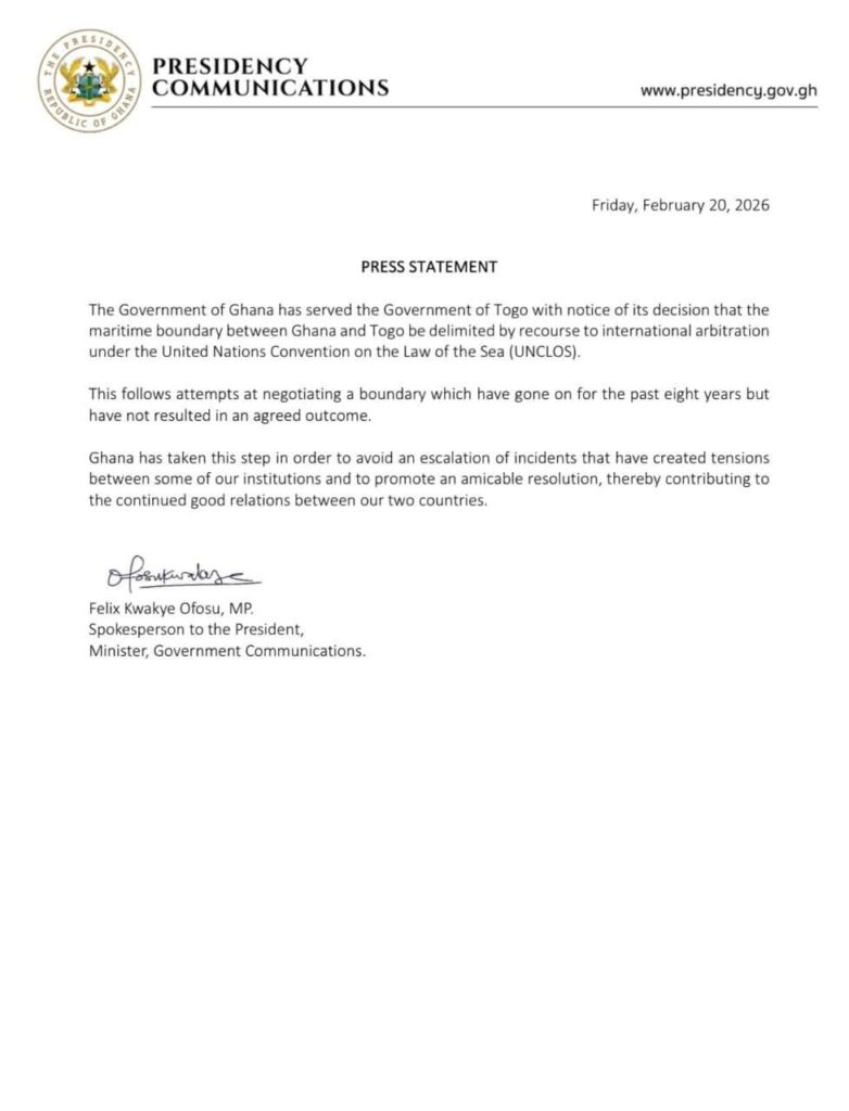 In a communication to Togo, Ghana indicated that it is turning to arbitration after prolonged efforts at dialogue did not yield the desired results. The government noted that the step is necessary to ensure clarity and legal certainty over the boundary.