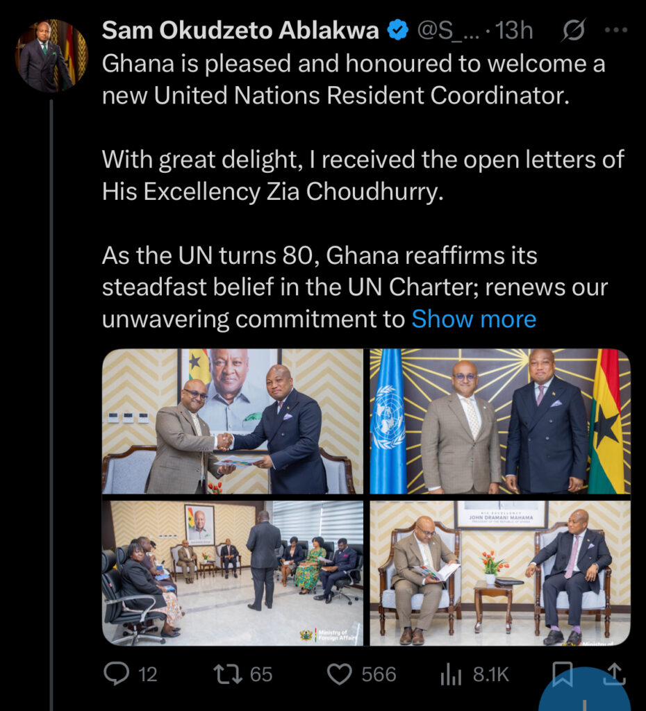 In a heartfelt post shared on his X (formerly Twitter) page, the Minister disclosed that he had received the open letters of His Excellency Zia Choudhury, the incoming UN Resident Coordinator to Ghana, marking the beginning of a new chapter in Ghana-UN relations.