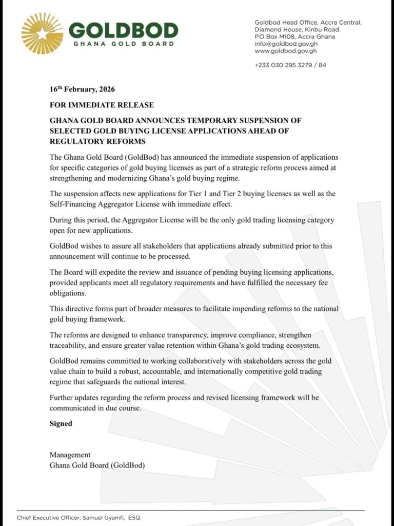 The Ghana Gold Board (GoldBod) has announced the immediate suspension of applications for selected gold buying licence categories as part of sweeping reforms aimed at strengthening and modernising the country’s gold trading regime.