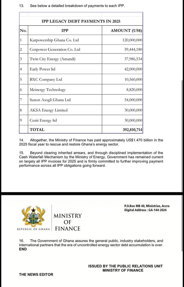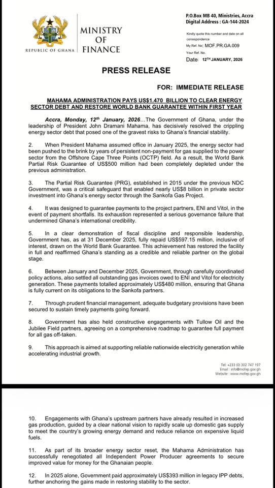 According to a statement issued by the Ministry of Finance on Monday, January 12, the payments were made within the first year of the Mahama Administration and targeted long-standing arrears that had pushed the energy sector close to collapse. The ministry explained that the intervention was aimed at restoring confidence, improving liquidity across the energy value chain, and preventing future supply disruptions.