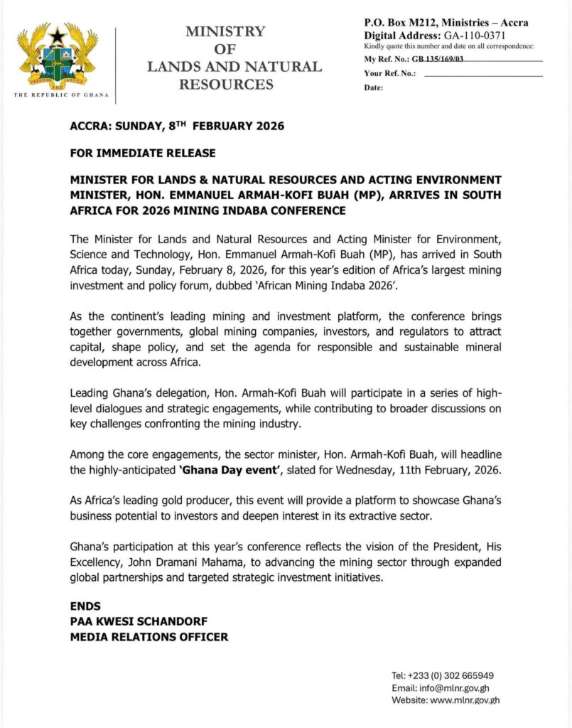 The Minister for Lands and Natural Resources and Acting Minister for Environment, Science and Technology, Hon. Emmanuel Armah-Kofi Buah (MP), has arrived in South Africa to participate in the 2026 African Mining Indaba Conference, Africa’s largest mining investment and policy forum.
