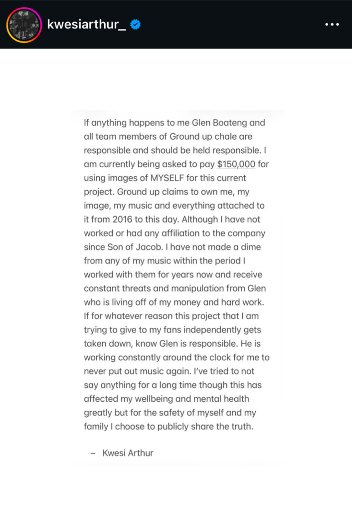Ghanaian rapper and singer Kwesi Arthur has gone public with serious allegations against his former management company, Ground Up Chale, and its Chief Executive Officer, Glen Boateng, sparking widespread debate within the music industry.