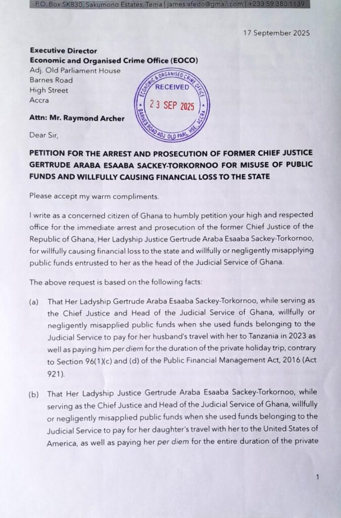 A private legal practitioner, James Kofi Afedo, has formally petitioned the Economic and Organised Crime Office (EOCO) to investigate, arrest, and prosecute the immediate past Chief Justice of Ghana, Justice Gertrude Araba Esaaba Sackey-Torkornoo, over allegations of financial impropriety.