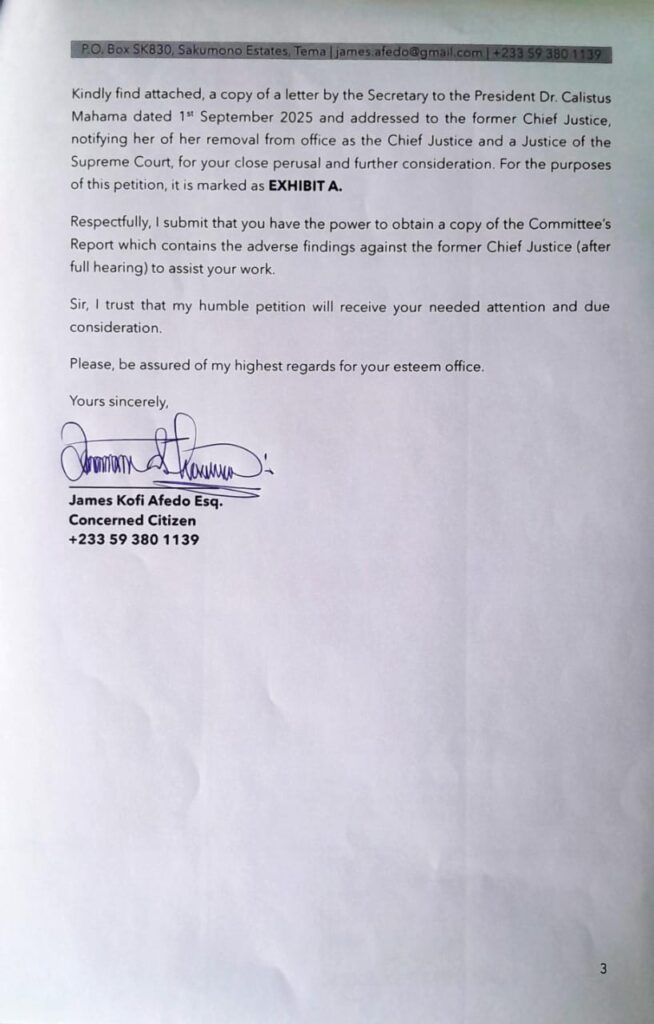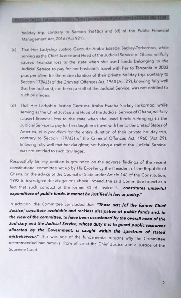“I write as a concerned citizen of Ghana to humbly petition your high and respected office for the immediate arrest and prosecution of the former Chief Justice of the Republic of Ghana, Her Ladyship Justice Gertrude Araba Esaaba Sackey-Torkornoo, for willfully causing financial loss to the state and willfully or negligently misapplying public funds entrusted to her as the head of the Judicial Service of Ghana,” portions of the petition stated.