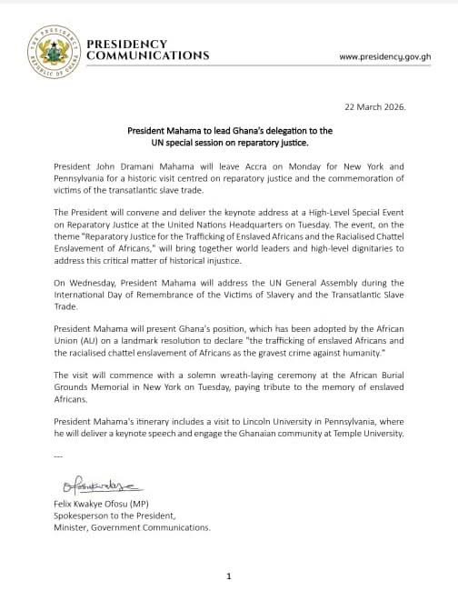 President John Dramani Mahama will depart Accra on Monday for New York and Pennsylvania to lead Ghana’s delegation to a historic United Nations engagement focused on reparatory justice and the remembrance of victims of the transatlantic slave trade.