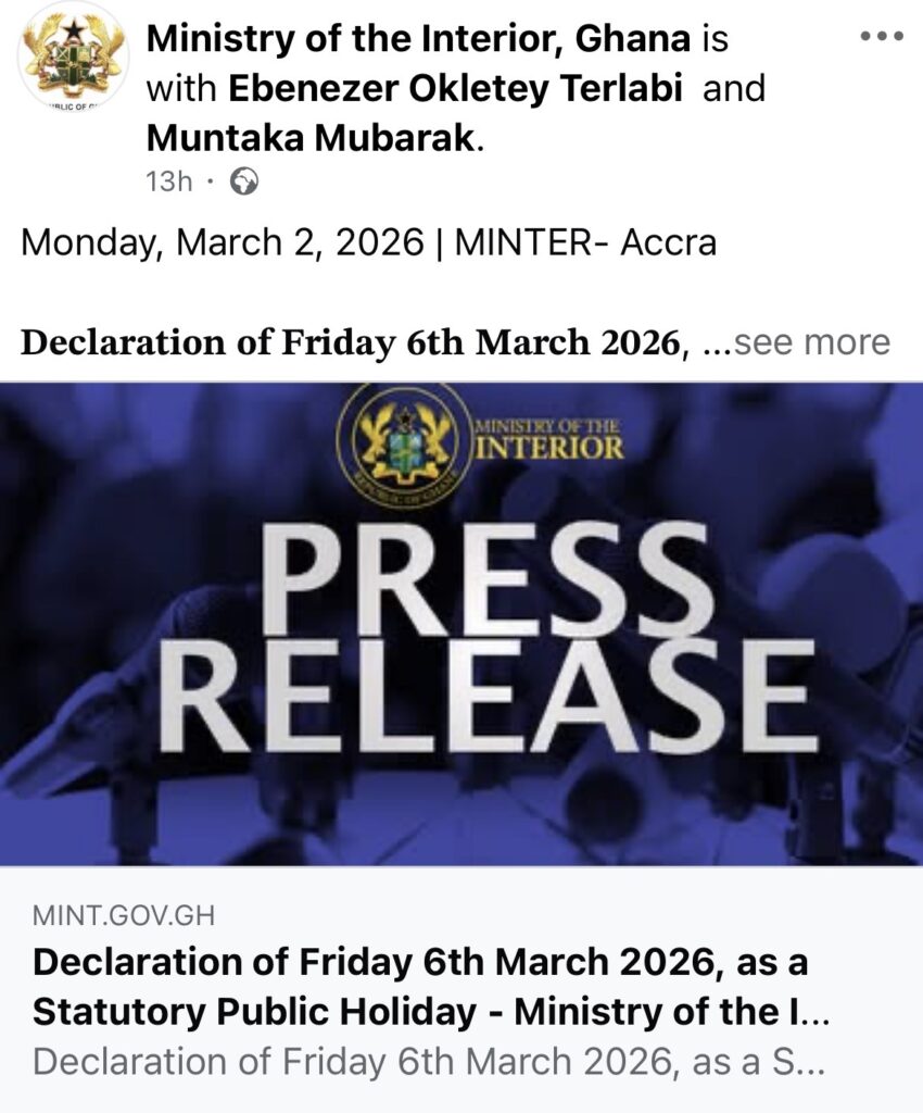 In a notice posted on its official Facebook page on Monday, March 2, the Ministry reminded the public to recognise and observe the day across all regions, in line with national law on public holidays. The announcement was signed by the Minister for the Interior, Muntaka Mohammed-Mubarak (MP).