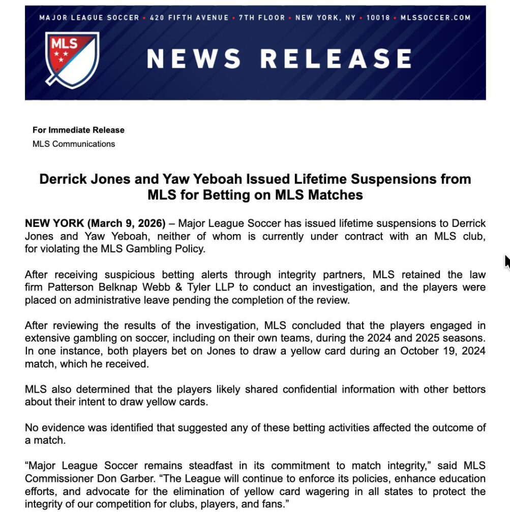 Following a review of the findings, MLS concluded that Jones and Yeboah were involved in extensive betting on soccer matches during the 2024 and 2025 seasons, including wagers on games involving their own teams.