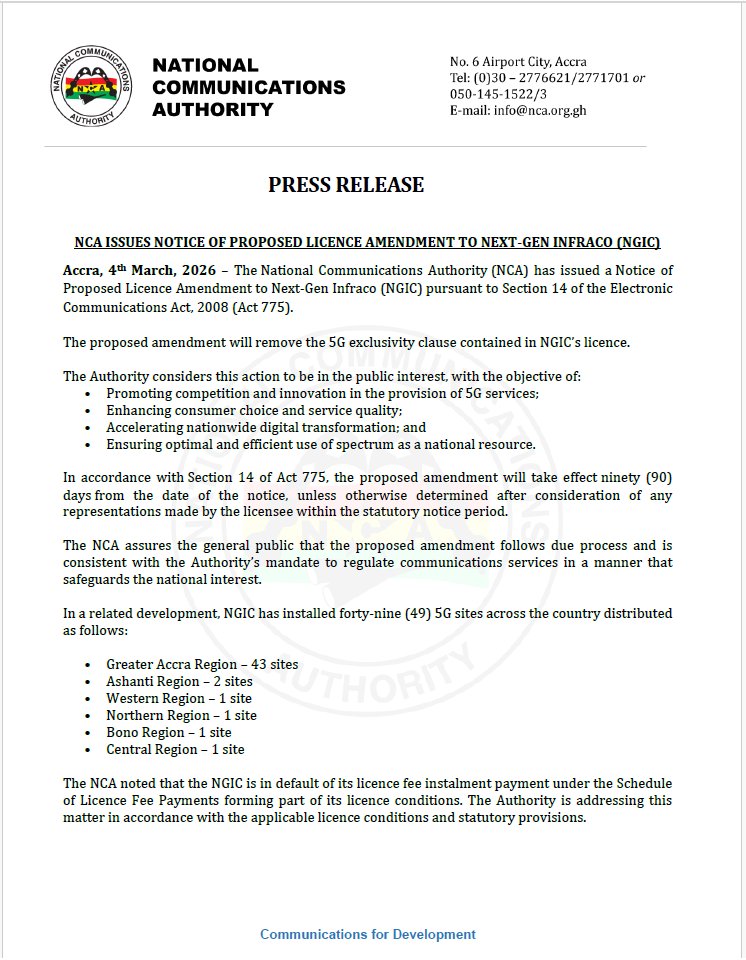 The National Communications Authority (NCA) has issued a Notice of Proposed Licence Amendment to Next-Gen Infraco (NGIC), seeking to remove the 5G exclusivity clause in the company’s licence.