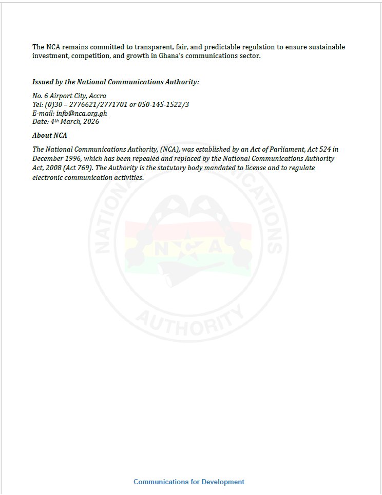 In a statement dated March 4, 2026, the Authority said the action is being taken pursuant to Section 14 of the Electronic Communications Act, 2008 (Act 775).