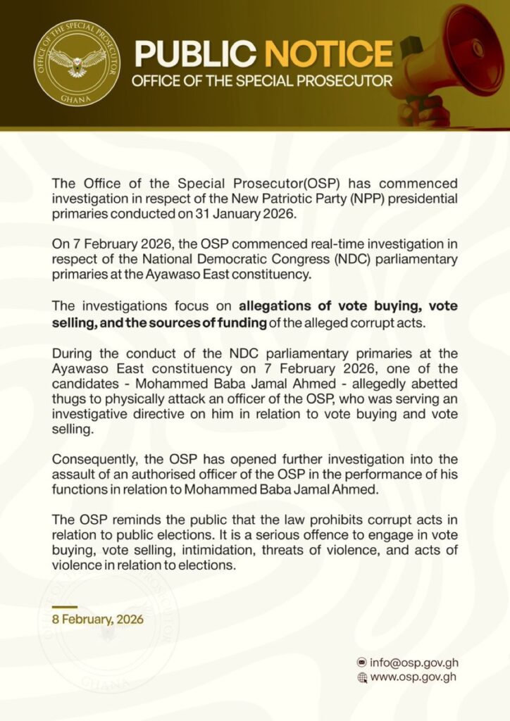 In a statement, the OSP announced that it has commenced investigations into the New Patriotic Party (NPP) presidential primaries conducted on 31 January 2026, focusing on allegations of vote buying, vote selling, and the sources of funds used to influence the process.