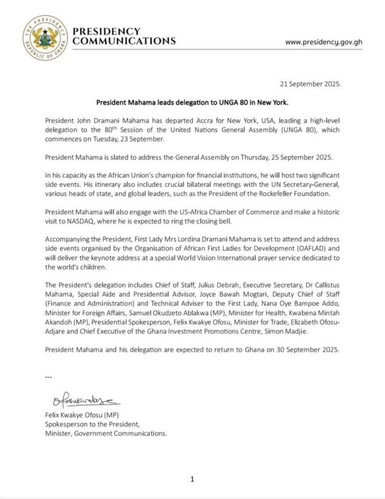 President John Dramani Mahama has left Accra for New York to attend the 80th Session of the United Nations General Assembly (UNGA 80), which opens on Tuesday, September 23, 2025.