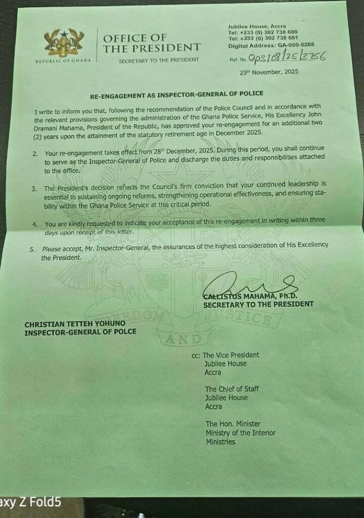 President John Dramani Mahama has approved a recommendation from the Police Council to grant Inspector-General of Police (IGP) Christian Tetteh Yuhonu a two-year contract extension. The re-engagement, confirmed in a letter dated November 25, 2025 and signed by the Secretary to the President, Dr. Callistus Mahama, takes effect from December 28, 2025.