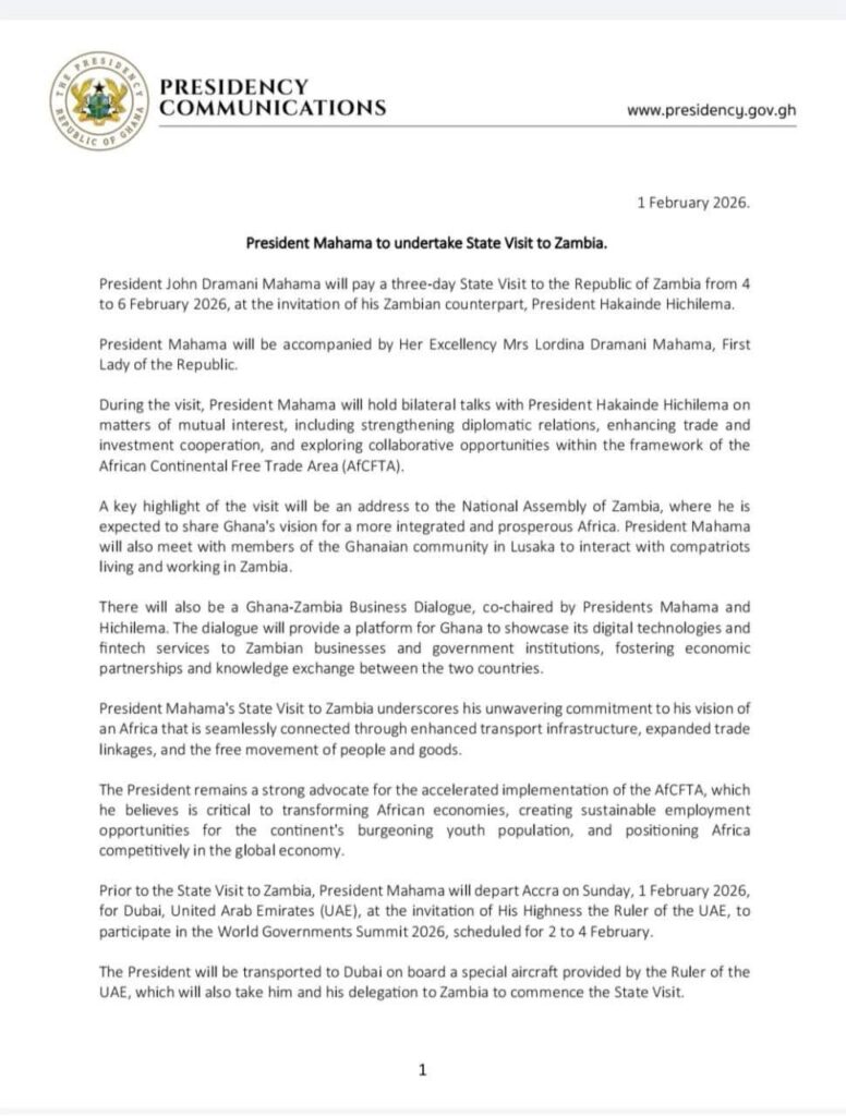 President John Dramani Mahama is set to embark on a three-day State Visit to the Republic of Zambia from February 4 to 6, 2026, following an invitation from his Zambian counterpart, President Hakainde Hichilema.