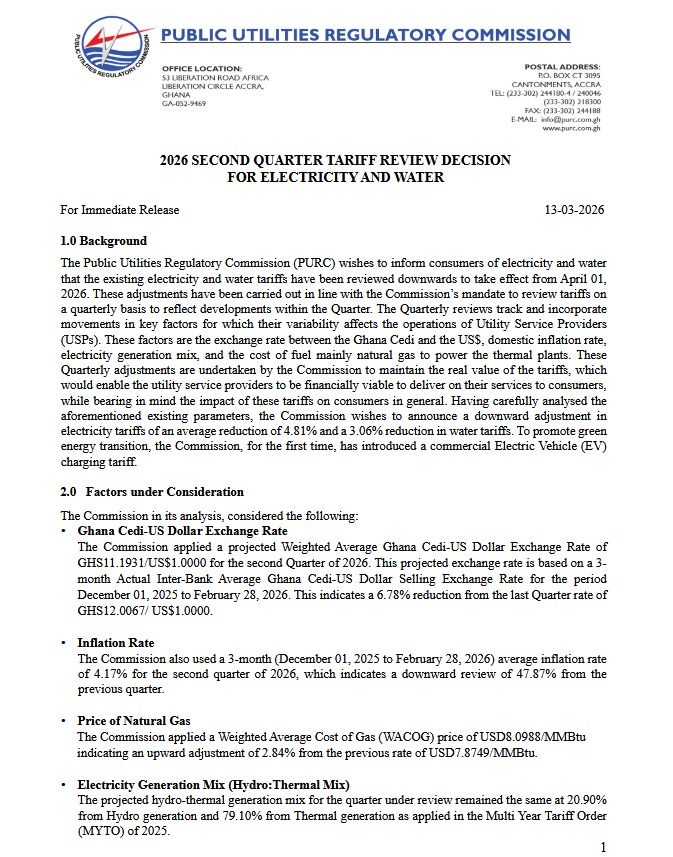The Public Utilities Regulatory Commission (PURC) has announced a reduction in electricity and water tariffs, offering modest financial relief to consumers across the country. The revised tariffs, which take effect from April 1, 2026, follow the Commission’s routine quarterly review of economic indicators and operational costs that influence utility pricing.