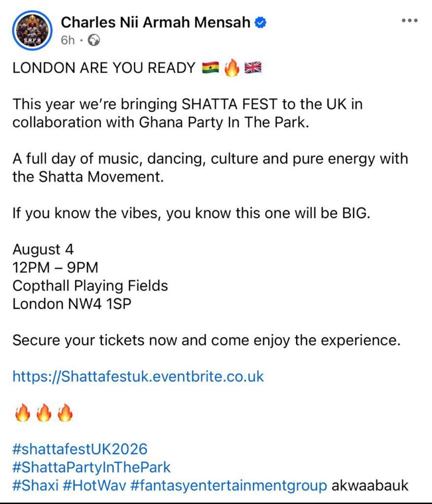 The award-winning artiste made the announcement on Monday, March 16, through a post on his Facebook page, revealing that Shatta Fest UK 2026 will be held in collaboration with the popular diaspora event, Ghana Party in the Park. The partnership is expected to attract thousands of music lovers from across the UK and Europe.