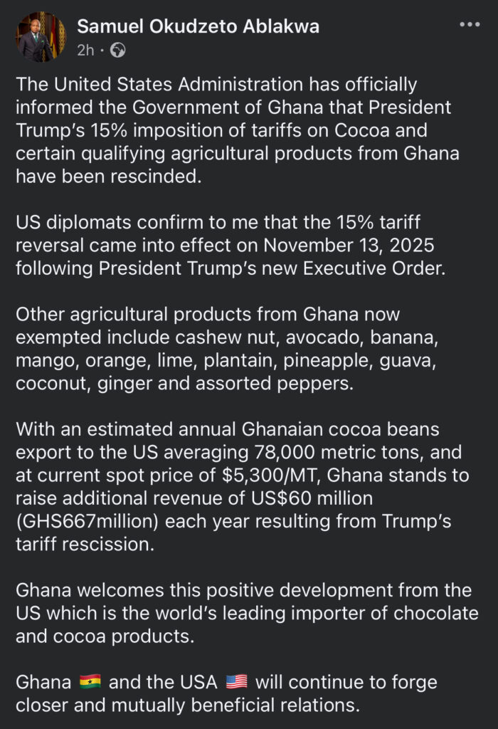 The Government of Ghana has announced that the United States has officially lifted the 15% tariff previously imposed on Ghana’s cocoa and selected agricultural exports. This marks a significant policy reversal with major implications for Ghana’s export earnings.