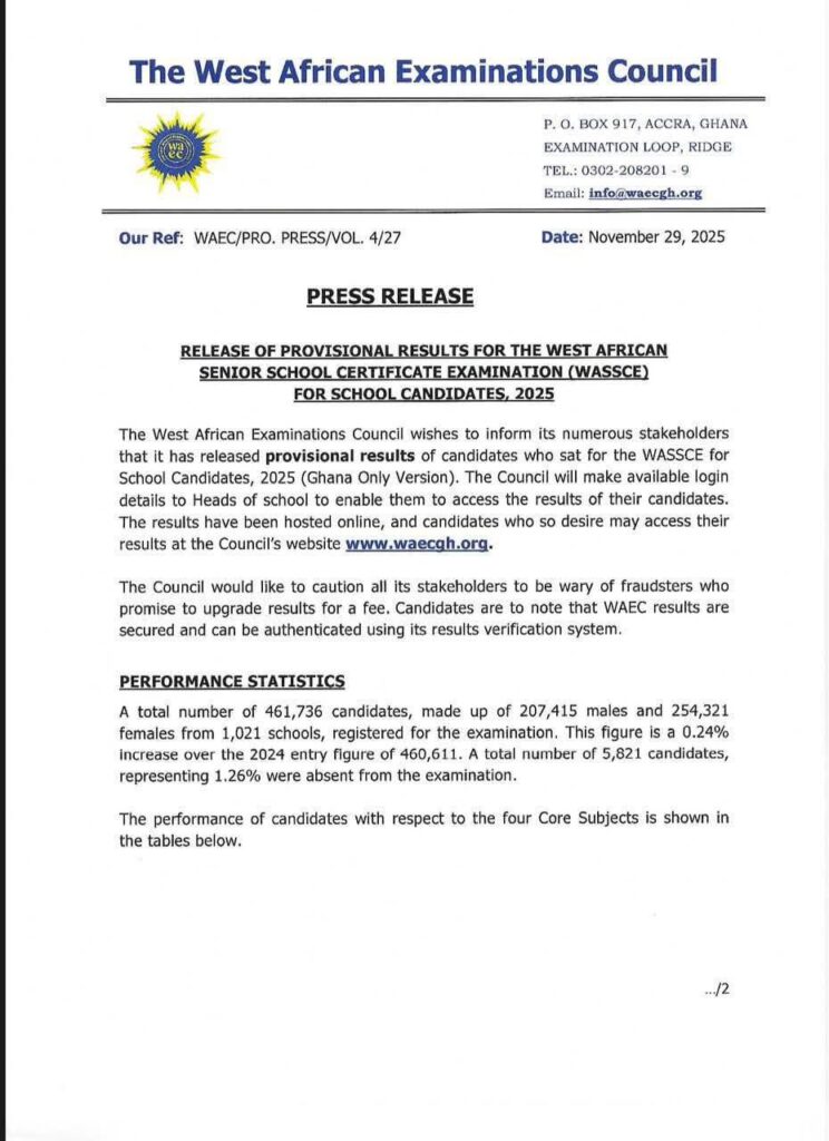 The West African Examinations Council (WAEC) has released the provisional results for the 2025 West African Senior School Certificate Examination (WASSCE), revealing a troubling dip in performance across the core subjects and a spike in examination malpractice cases.