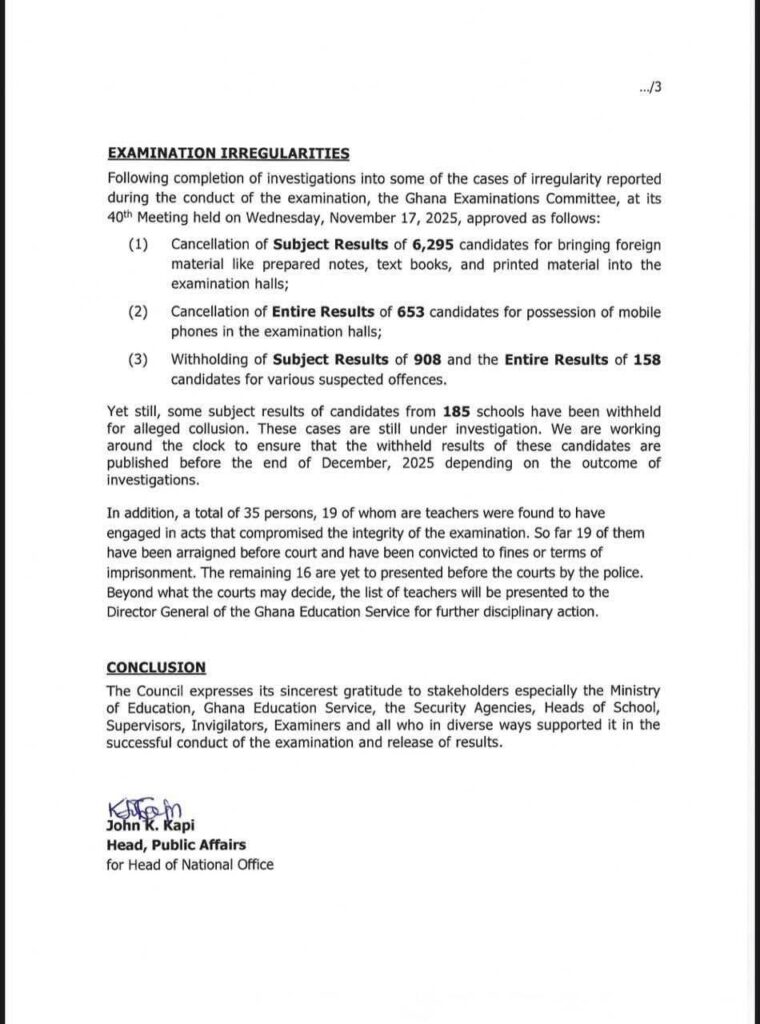 After completing investigations into widespread irregularities, the Ghana Examinations Committee, at its 40th meeting on November 17, 2025, approved a series of sanctions.